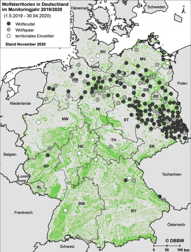 Auf der DBBW-Website finden sich u.a. Rasterzellenkarten zum Wolfsvorkommen in Deutschland und auch Karten zu Wolfsterritorien je Bundesland, welche kontinuierlich aktualisiert werden.