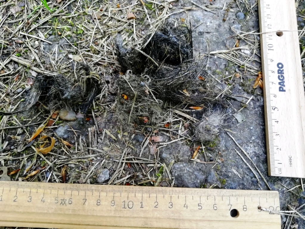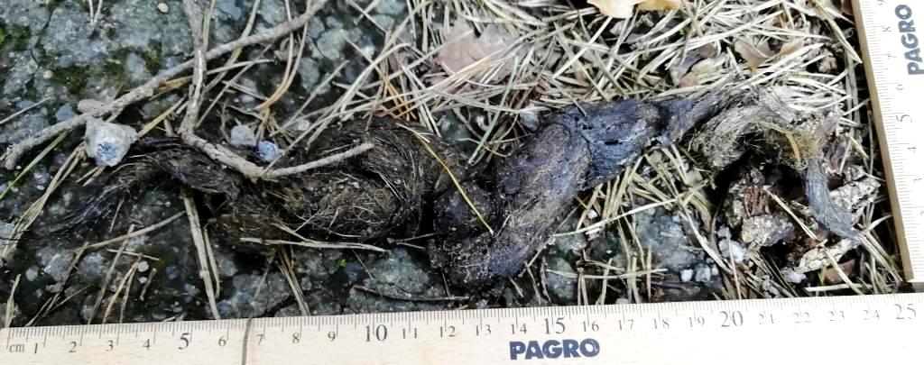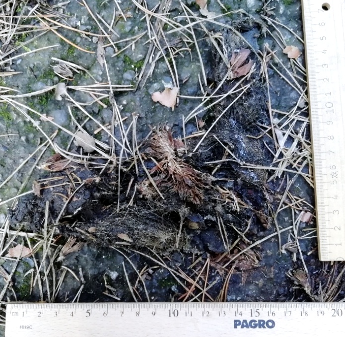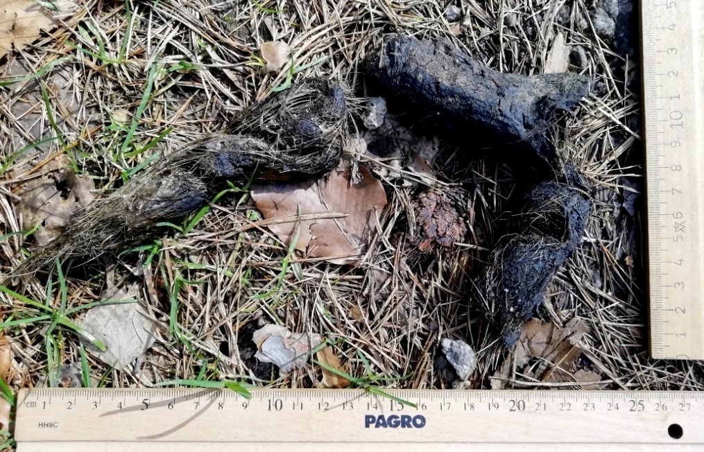 Und das ist der tolle Fund, den die beiden Doggies gemacht haben, nicht mehr sonderlich frisch, aber mit typischem Inhalt (alle Fotos sind vom März 2021). Übrigens werden bei Spuren von Tieren/Pflanzen, die streng geschützt sind, keine Ortsangaben nach außen getragen, weshalb ich auch die Fotos so zurechtgeschnitten hab, dass die Region nicht erkennbar ist. In Brandenburg erhält das LfU (Landesamt für Umwelt) die exakten Daten von allen, die am Wolfsmonitoring beteiligt sind. Daraus wird dann der jährliche Bericht zum Wolfsvorkommen in Brandenburg erstellt, welcher wiederum – wie die Berichte der anderen Bundesländer – die Grundlage für den oben erwähnten DBBW-Statusbericht über Wölfe in ganz Deutschland ist.