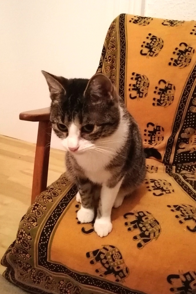 Der 8-jährige – aus früherem ModeUNsinn kupierte – Kyrill, wegen chronischer Bauchspeicheldrüsenerkrankung ziemlich abgemagert, trug seinen Maulkorb eher gelassen als notwendiges Übel.