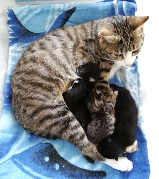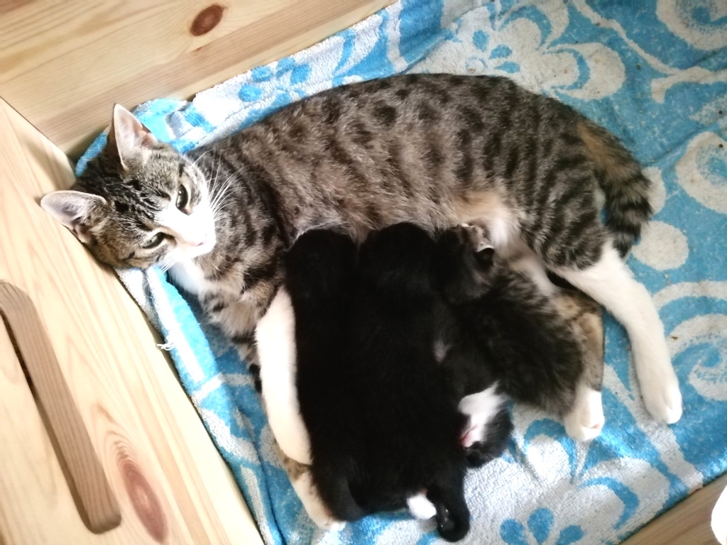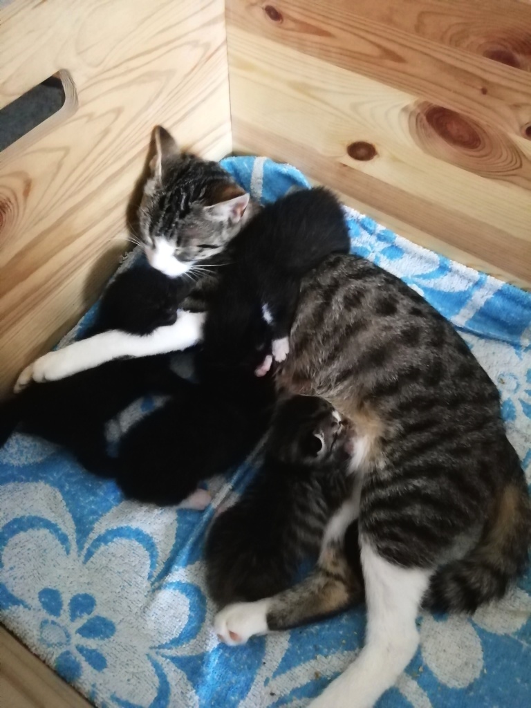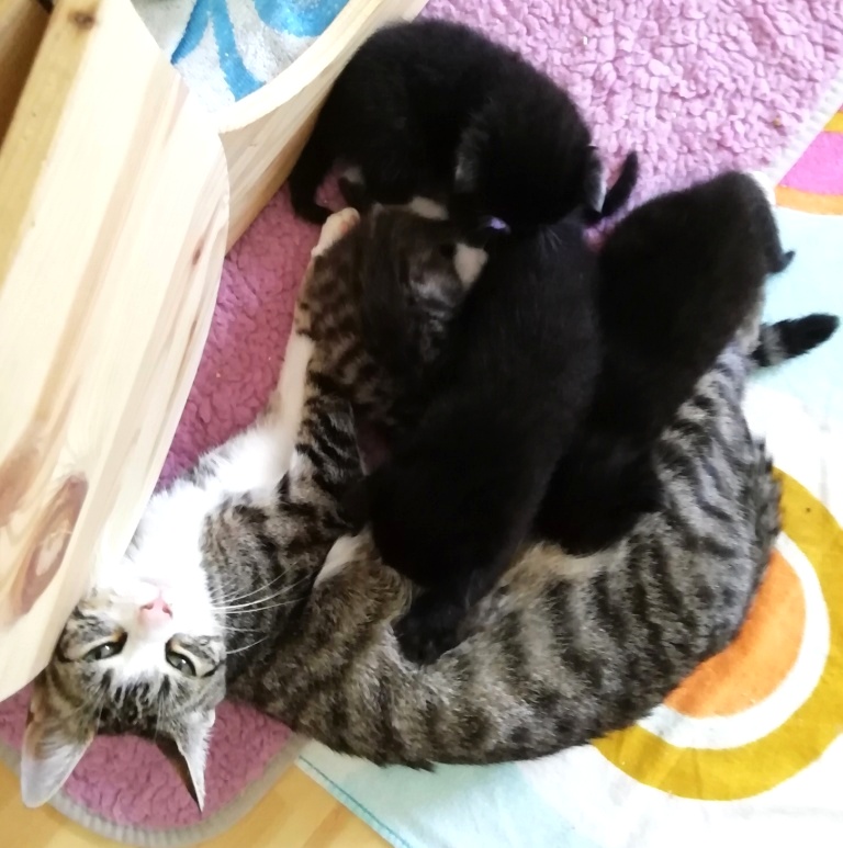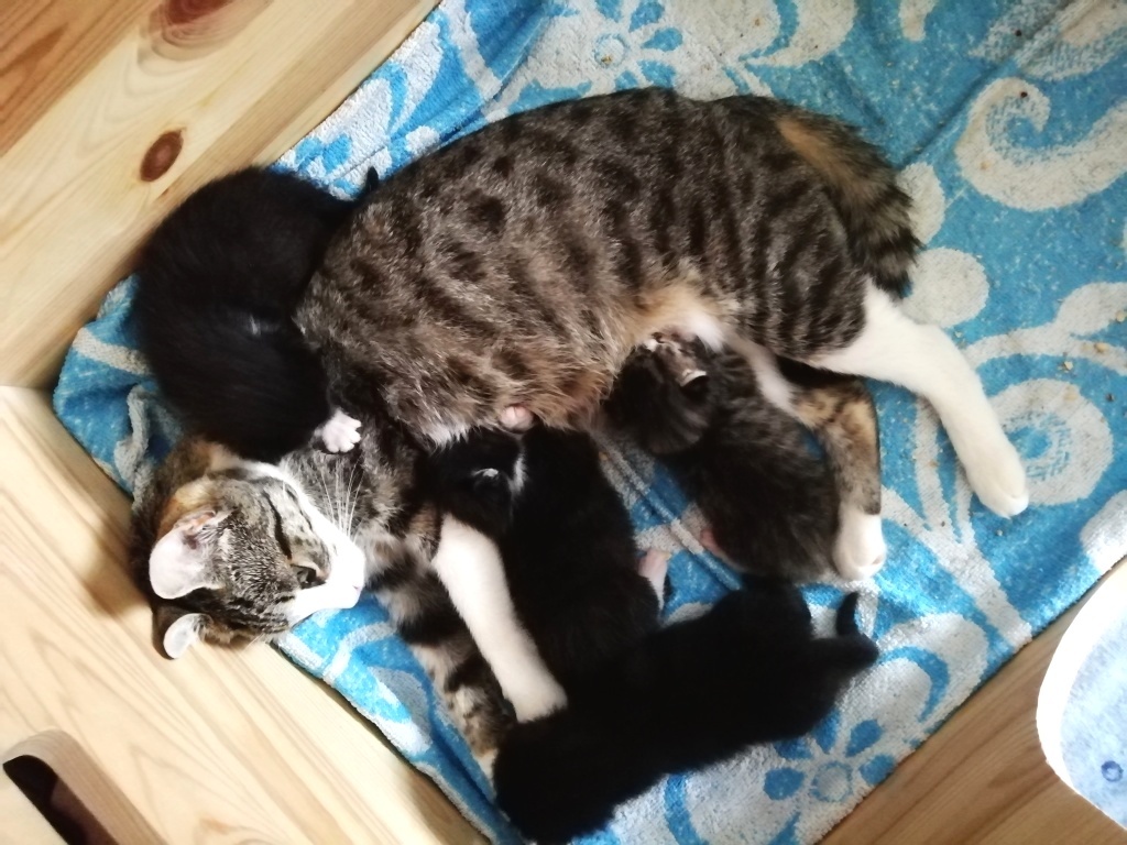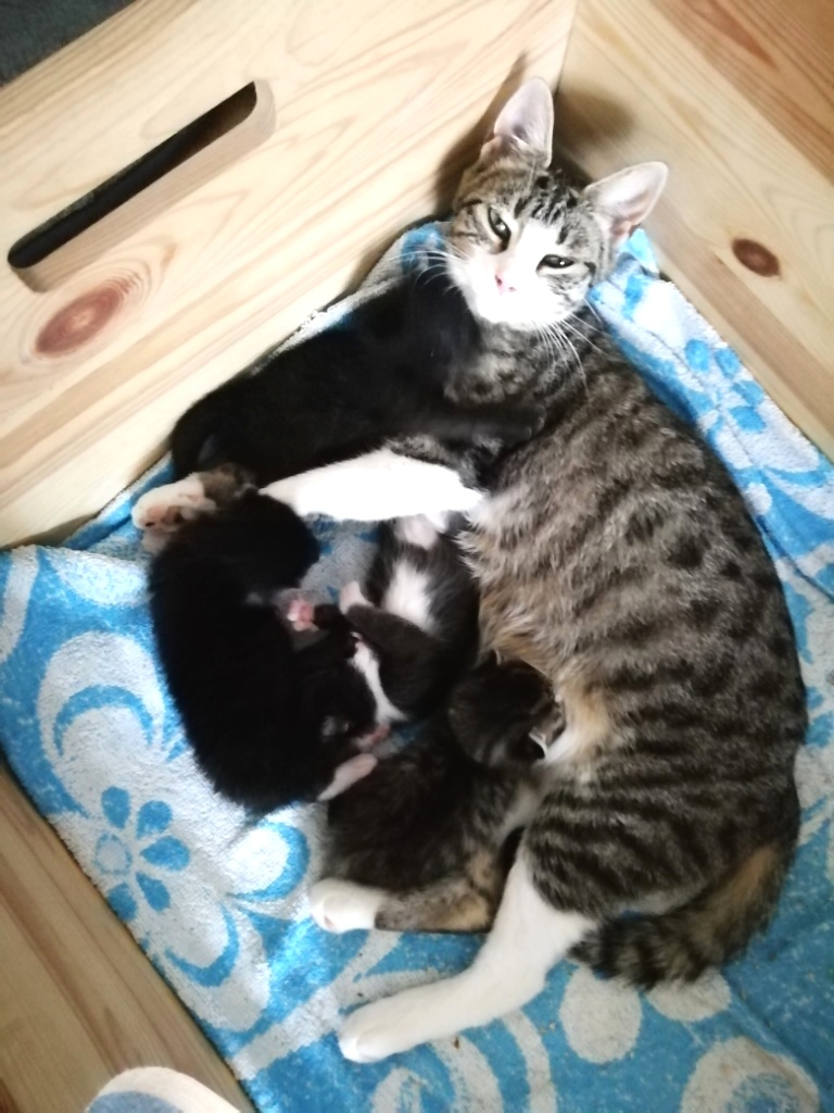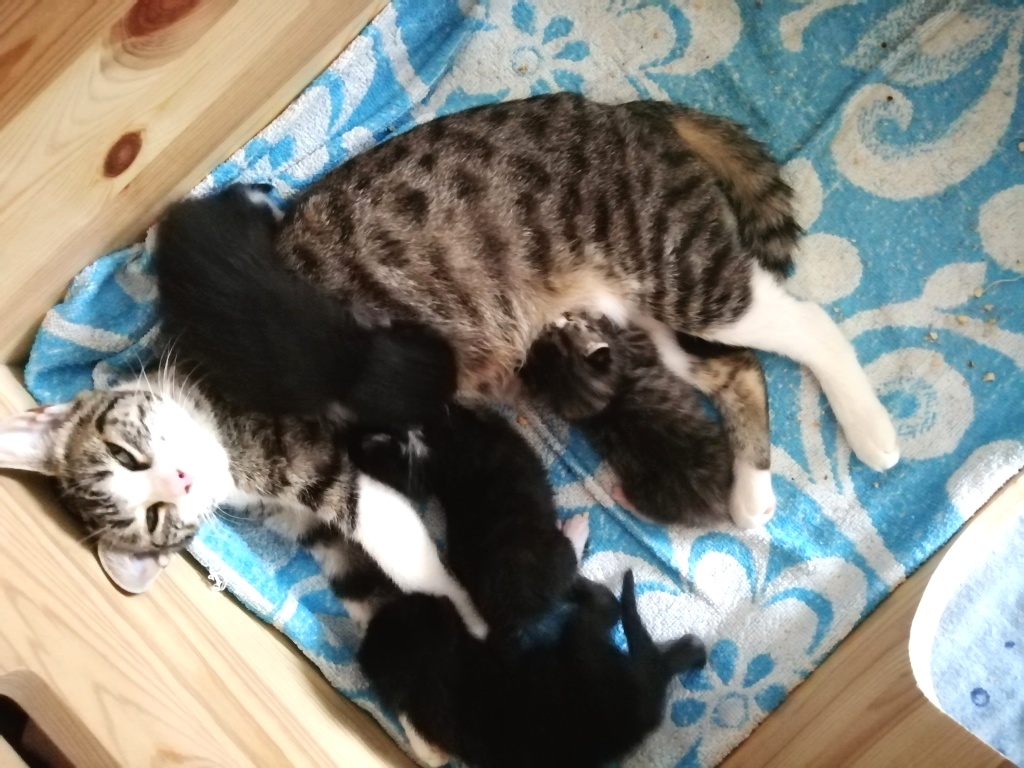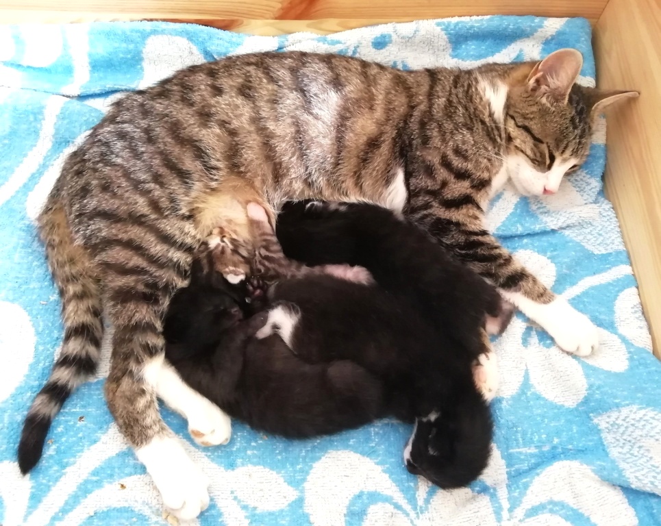 In der Nacht vom 19. zum 20. Juli 2019 brachte die tapfere Katzenmami – selbst noch ganz jung – vier gesunde Kitten zur Welt: eines graugetigert wie sie, die drei anderen schwarz mit weißen Flecken. Als Geburtshelfer waren Feriengäste der Bungalowanlage „Zur Jagdhütte“ am Chossewitzer See tätig, denn das hübsche, verschmuste Kätzchen war bereits im Mai dort zugelaufen und seither „Dauergast“. Doch für die junge Familie wird es in einer Ferienbungalowanlage viel zu turbulent (noch dazu wären die Kleinen leckere Appetithappen für Fuchs & Co.), weshalb meine Freundin Monika Jung, die Betreiberin und Köchin der „Jagdhütte“, mich verständigte, denn sie weiß ja, dass ich auch Pflegetiere betreue.