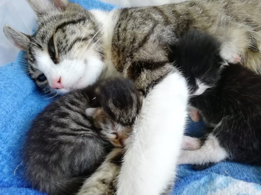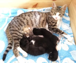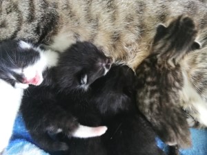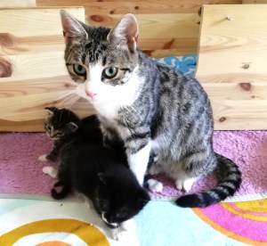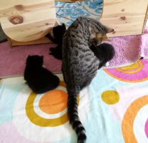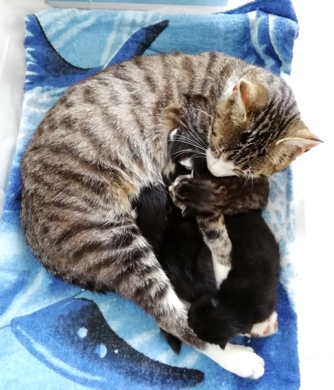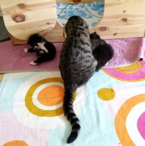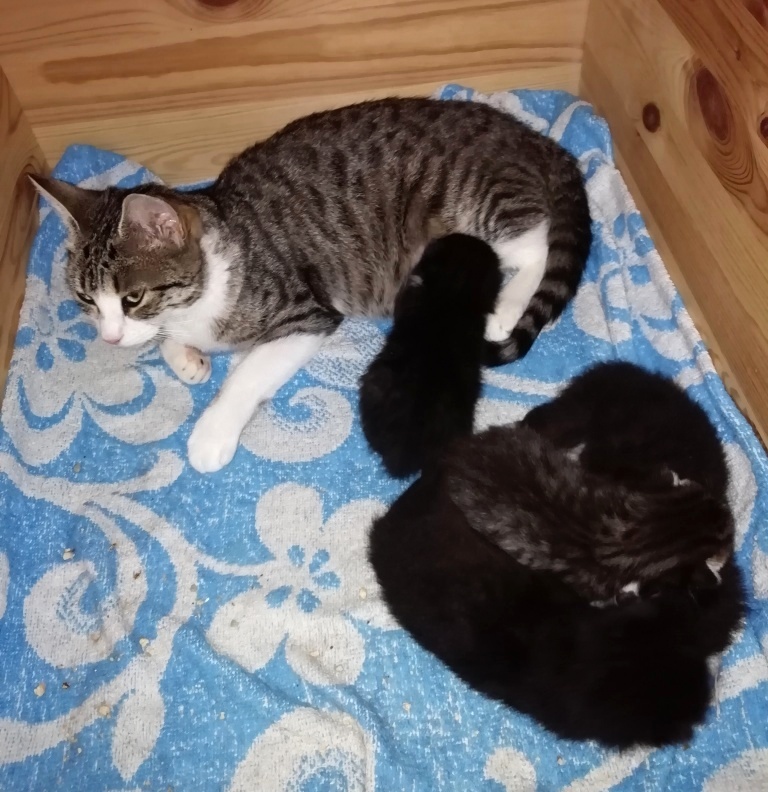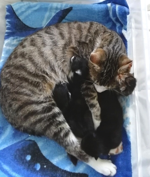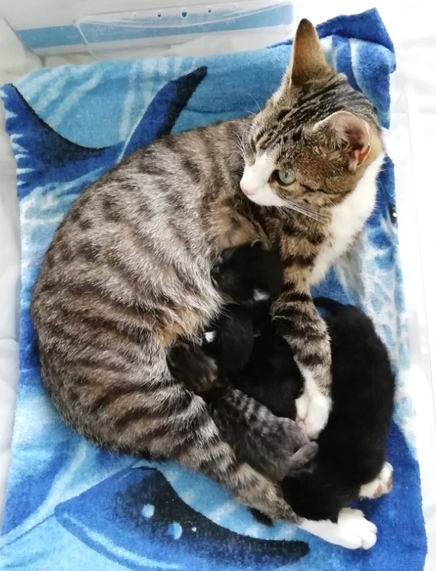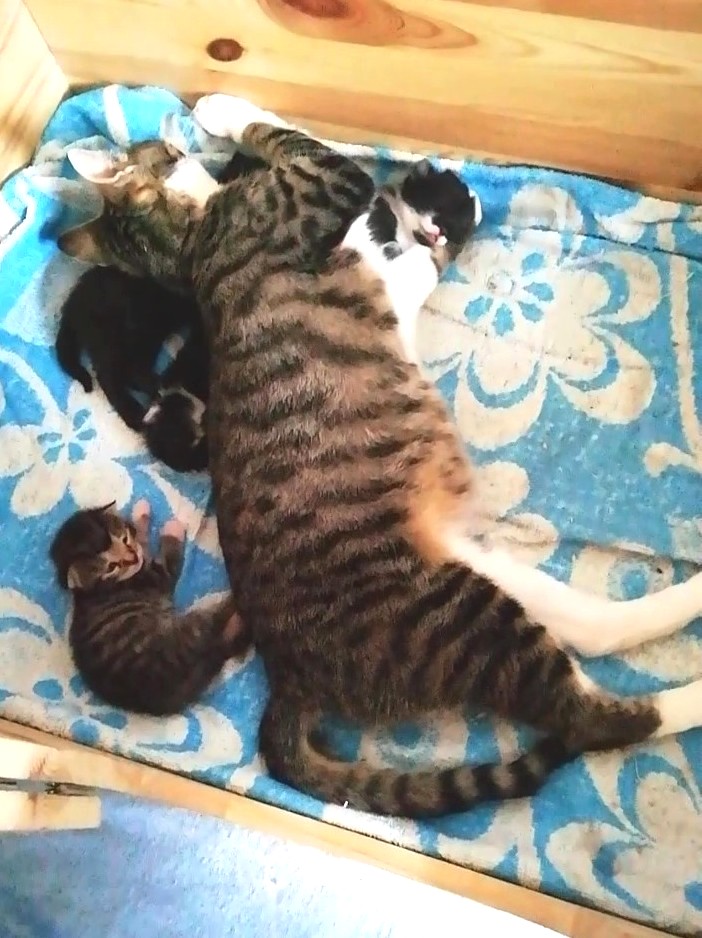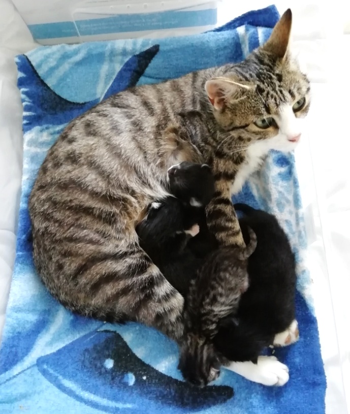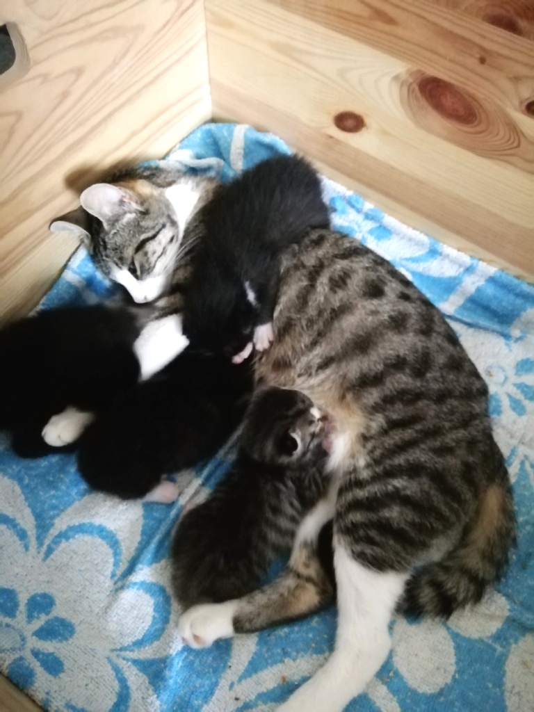 In der Nacht vom 19. zum 20. Juli 2019 brachte die tapfere Katzenmami – selbst noch ganz jung – vier gesunde Kitten zur Welt: eines graugetigert wie sie, die drei anderen schwarz mit weißen Flecken. Als Geburtshelfer waren Feriengäste der Bungalowanlage „Zur Jagdhütte“ am Chossewitzer See tätig, denn das hübsche, verschmuste Kätzchen war bereits im Mai dort zugelaufen und seither „Dauergast“. Doch für die junge Familie wird es in einer Ferienbungalowanlage viel zu turbulent (noch dazu wären die Kleinen leckere Appetithappen für Fuchs & Co.), weshalb meine Freundin Monika Jung, die Betreiberin und Köchin der „Jagdhütte“, mich verständigte, denn sie weiß ja, dass ich auch Pflegetiere betreue.