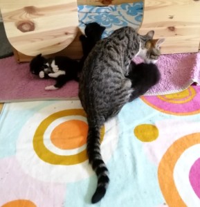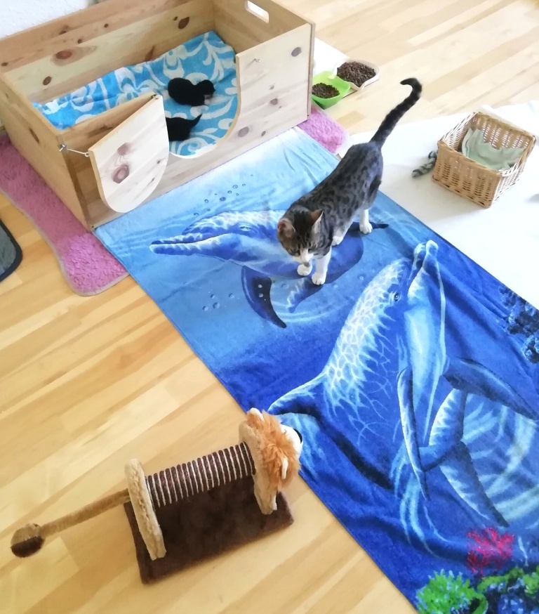 Diese Tage standen im Zeichen des Umzugs der Kätzchen in das neu eingerichtete Katzenzimmer. Die Kleinen kriegten davon zwar nichts mit (außer dass sie nun in der neuen Wurfkiste viel mehr Platz zum Herumrobben haben), aber für die Katzenmama (und auch für mich als „Katzenoma“) war das alles schon (freudig) aufregend!