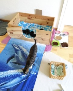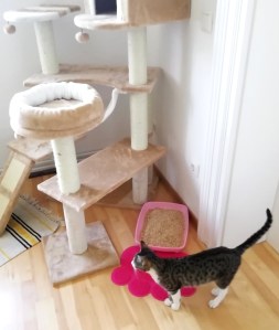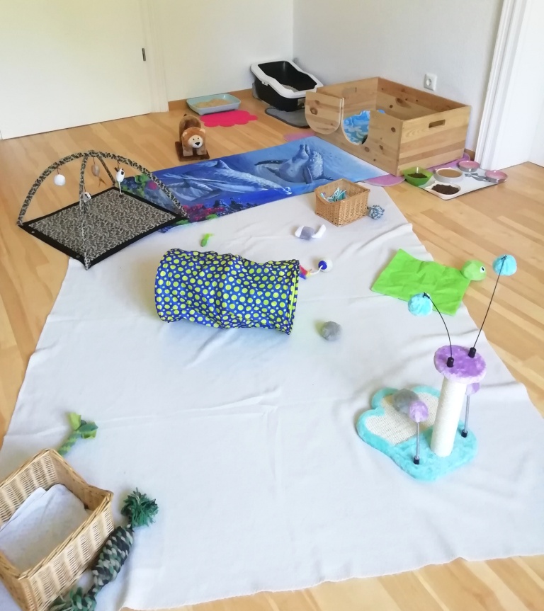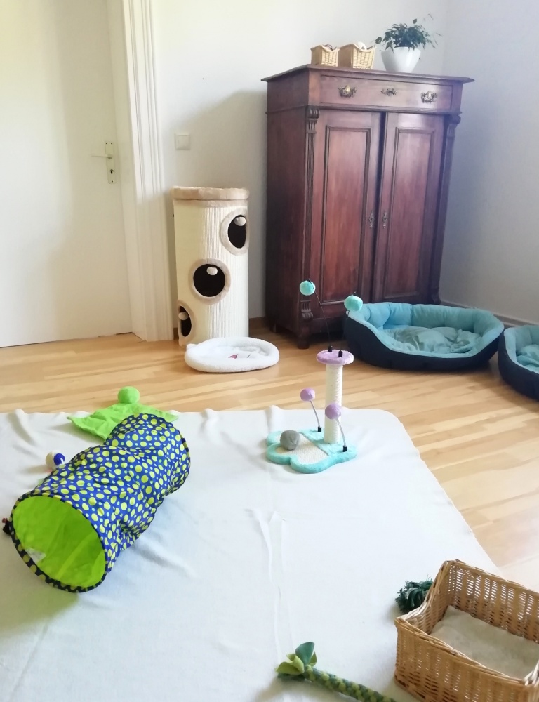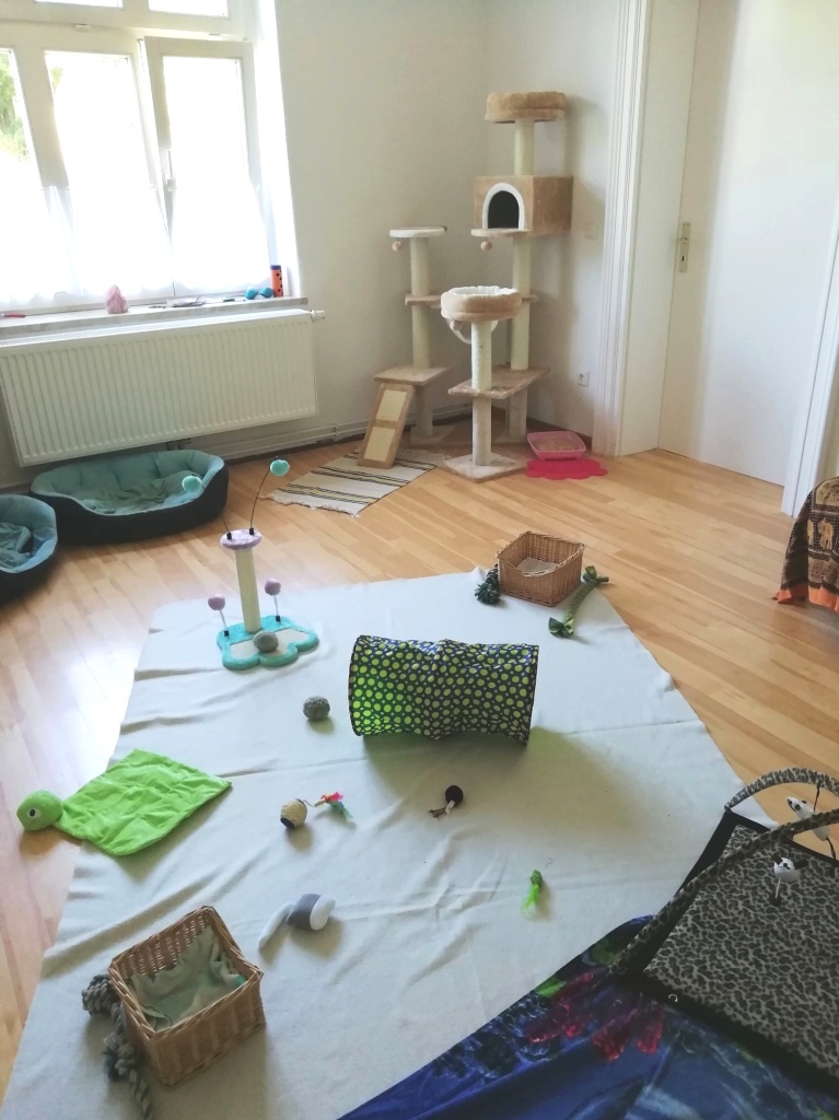 Im kleinen Gästebad war es viel zu stickig und zu eng, außerdem wollte ich meiner Katzenfamilie etwas bieten, also funktionierte ich das noch leer stehende (zukünftige) Beratungszimmer kurzfristig zum „Katzenzimmer“ um – und das Ergebnis kann sich sehen lassen: