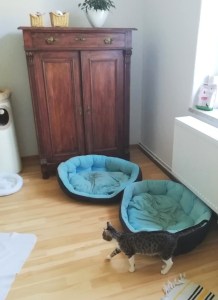 Besides: Die Hundebetten platzierte ich ganz bewusst im Katzenzimmer, ebenso einige (gebrauchte) Hundespielsachen, damit alle Kätzchen mit dem Geruch von Hunden vertraut werden. Außerdem fing ich bereits vor einigen Tagen mit ersten behutsamen Kennenlernschrittchen an: Hund & Katz konnten einander auf Entfernung ankucken und mittlerweile klappt das schon ohne Gepfauche.