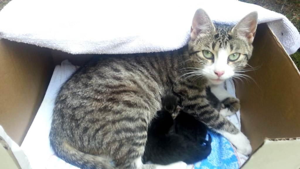 Tierschutz-Notfall: Eine sehr hübsche und sehr junge Katze bringt vier gesunde Kitten zur Welt – von Mirjam Silber und ihrem erst in Planung befindlichen Verein Schlaubetal-Caniden e.V. wird die Katzenfamilie in Pflege genommen.