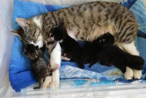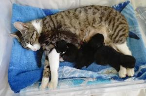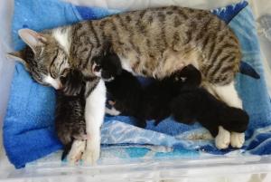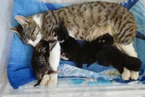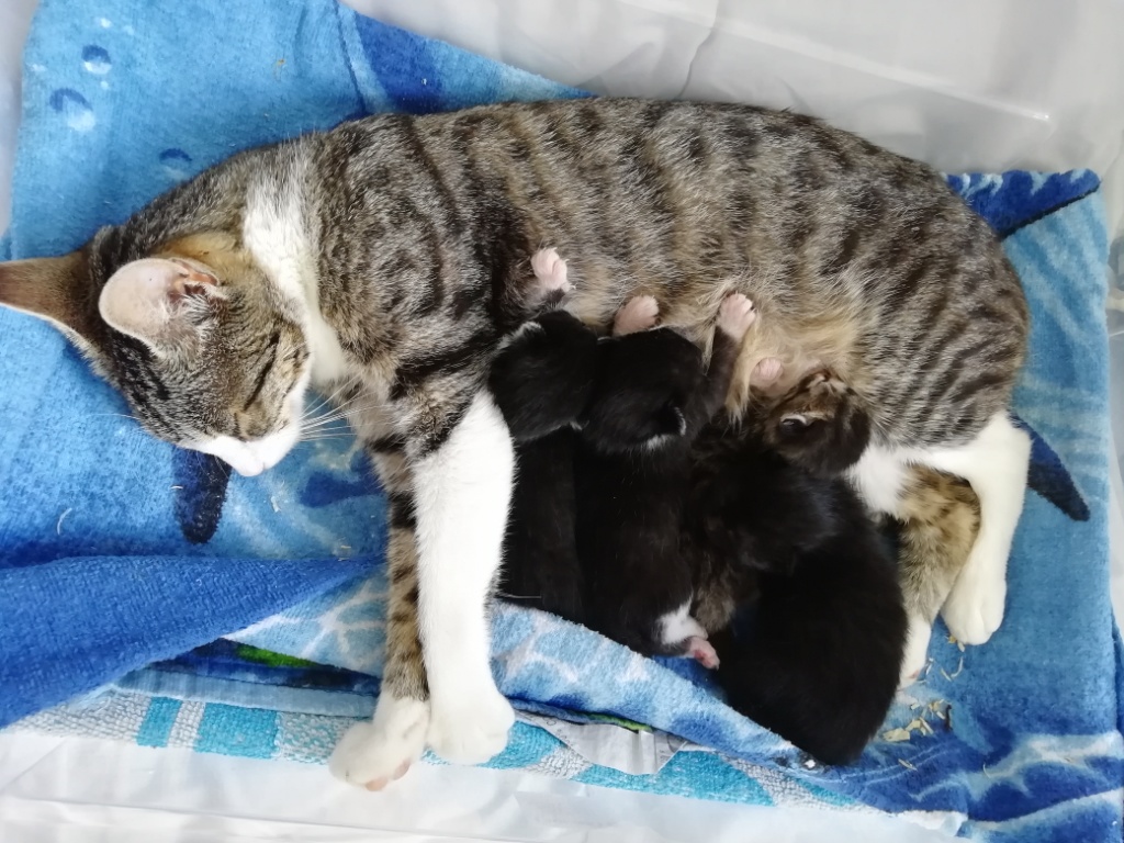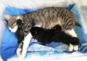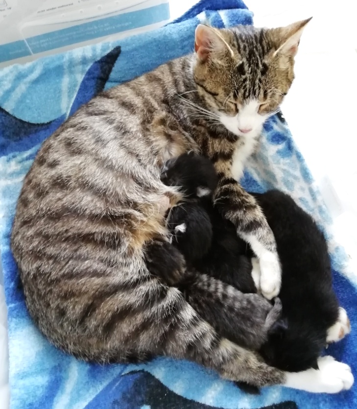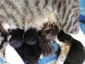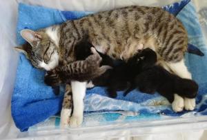 Dabei ist diese junge Katzenmami ganz besonders fürsorglich und liebevoll mit ihren Babies, nicht nur stillt und säubert sie ihre vier Winzlinge hingebungsvoll, sondern hält auch die Wurfkiste rein und geht brav auf´s Katzenklo – quasi eine „Einserschülerin“! Sie frisst und trinkt mit großem Appetit, sodass alle einen hervorragenden Eindruck machen!