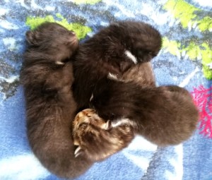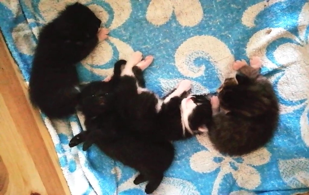 Das ganz schwarze Kätzchen, von Anfang an das größte Baby, scheint völlig „cool“ zu sein: während sich die anderen beim „Milchtreteln“ abstrampeln, liegt es gemütlich eingerollt da und schläft … und schläft … und schläft …