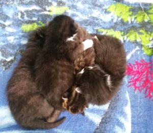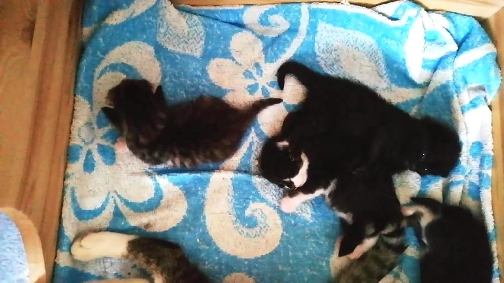 Die Katzenmami kommt dann immer gleich herbei, merkt aber, dass ich mich gut um ihre Kleinen kümmere und streicht mir danach hingebungsvoll um die Beine:-) Wenn ich die Kitten wieder in die Wurfkiste setze, steigt sie sofort mit hinein und sammelt ihre Baby-Schar um sich. Bei solch aufregenden und anstrengenden Erlebnissen wird natürlich – nach einem kurzen Schlummertrunk – ausgiebigst geschlafen;-)