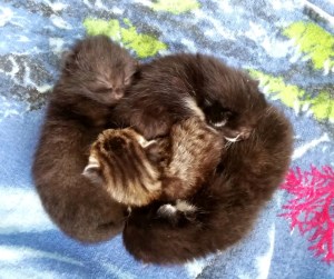 Zurzeit haben die Kitten anhand typischer Unterscheidungsmerkmale erst eine Art „Erkennungsnamen“ (wenn sie dann größer sind, bekommen sie natürlich „richtige“ Namen): das getigerte Baby heißt „Tigerchen“, das eine schwarzweiße mit den weißen Backen und den weißen Hörnern neben der Nase „Hörnchen“, das andere schwarzweiße, welches nur weiße Backen hat, „Bäckchen“ und schließlich das schwarze „Bärli“, weil es wie ein süßes Teddybärchen aussieht!