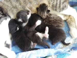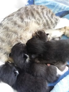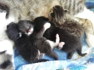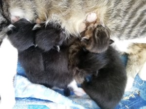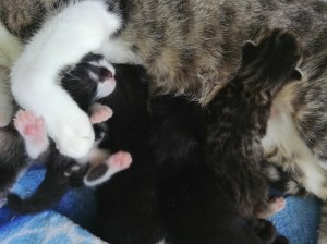 Die Katzenbabys werden unermüdlich und liebevoll von ihrer Mami umsorgt. Trotz ihrer eigenen Jugend ist sie eine vorbildliche Katzenmama. Es ist so wundervoll, ihr zuzuschauen, wie sie instinktiv alles, aber auch wirklich alles richtig macht. Darum wachsen und gedeihen ihre Kitten auch so prächtig! Obzwar die nachgeburtliche Entwicklungsphase in erster Linie mit Saugen und Schlafen einhergeht, merkt man Tag für Tag mehr Bewegung und Beweglichkeit, außerdem zeichnen sich bereits gewisse „Charakterköpfe“ ab;-)