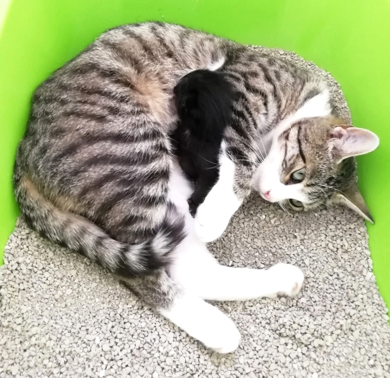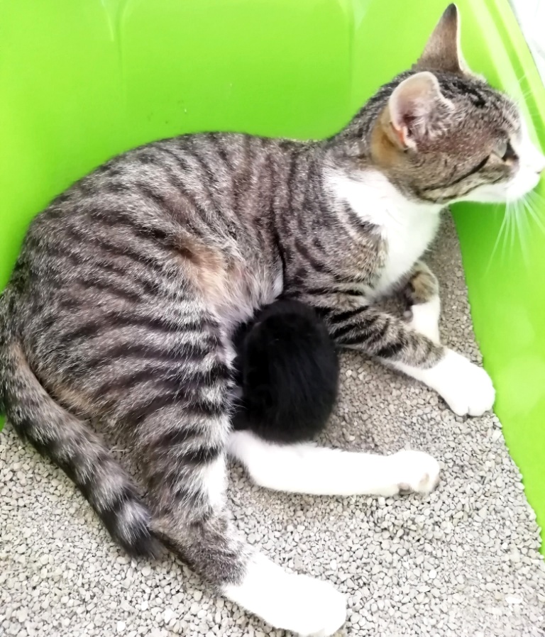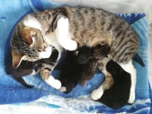 Da es sich um eine sehr zutrauliche, zärtliche und gepflegte Katze handelt, liegt die Vermutung nahe, dass sie früher ein Zuhause hatte, von dem sie entweder weglief oder – wie ich es in meiner Tierschutzarbeit leider immer wieder erlebe – wegen ihrer Trächtigkeit ausgesetzt wurde. Es gibt auch heute noch Leute, die nicht bereit sind, die Verantwortung und Kosten für eine prophylaktische Kastration bzw. für Babykätzchen zu tragen! Was für eine Schande!