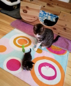 Auch wenn die große weite Welt momentan erst aus einem Teil des Katzenzimmers besteht, so ist es für die Kitten doch ziemlich spannend und aufregend, dies alles zu erkunden – und das auf vier Pfoten GEHEND (Robben und Krabbeln war gestern, was eine Katze von Welt sein will, läuft natürlich in zierlichen Schrittchen über´s Parkett – wenn wir mal ausrutschen, tun wir so als ob gaaaaaar nix passiert sei, stehen wieder auf und stolzieren hocherhobenen Schwanzes weiter)! Aber im Grunde unseres Herzens sind wir schon froh, wenn unsere Mami in der Nähe ist!